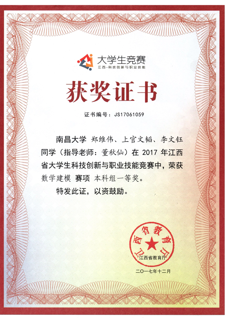 Jiangxi Province of the Higher Education Society Cup National College Students Mathematical Modeling Contest (First Prize)Last updated on Dec 5, 2024Go to Project Site Image credit: [Jiangxi Department of Education](/reward/Bachelor-Modeling/关于公布 2017 年江西省大学生数学建模竞赛获奖名单的说明.pdf)Math ModelingWeiwei ZhengPh.D. CandidateMy research interests include regional economics, industrial economics, and spatial econometrics theory & application.