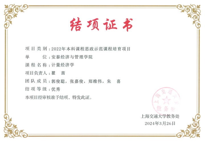 Undergraduate Ideological and Political Demonstration Course Cultivation Project "Econometrics" (Excellent Completion)Last updated on Sep 24, 2025Go to Project Site Image credit: SJTU2024.03 上海交通大学思政示范课程结项-优秀证书-计量经济学TeachingWeiwei ZhengPh.D. CandidateMy research interests include regional economics, industrial economics, and spatial econometrics theory & application.